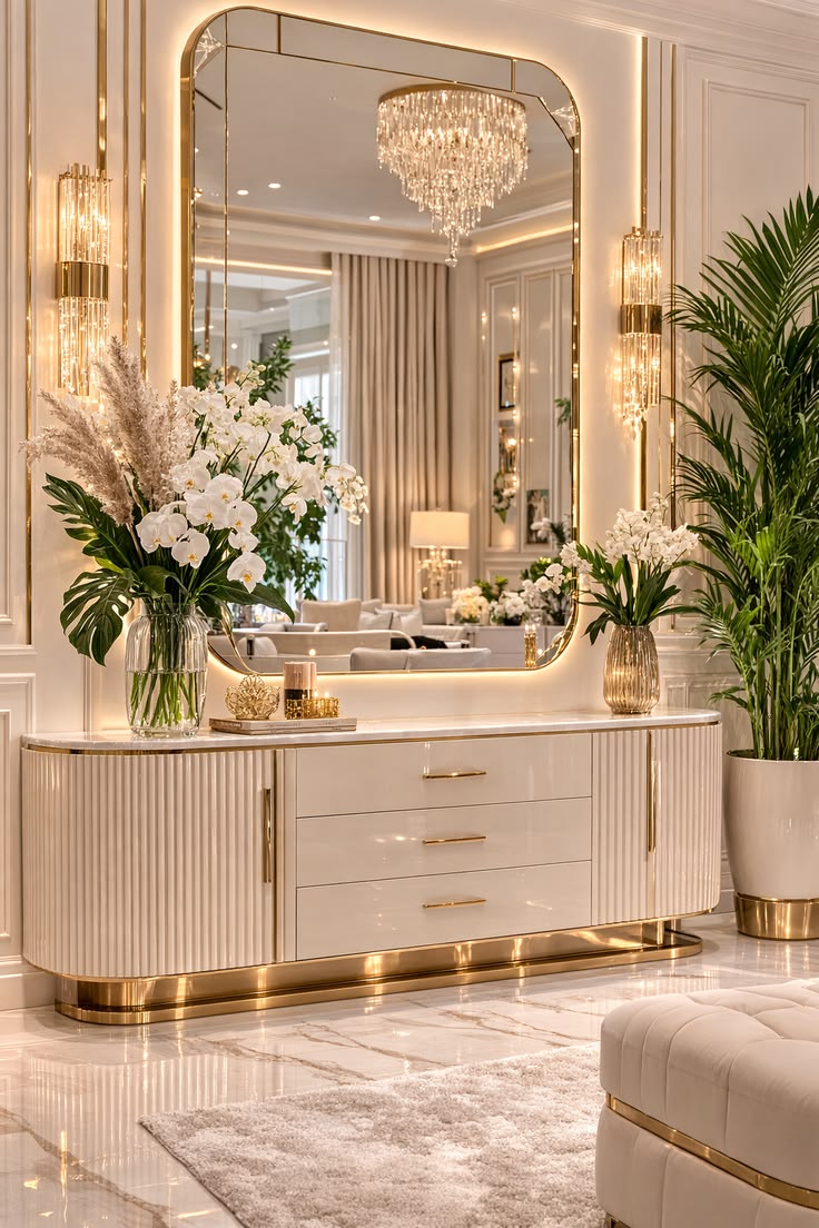 Introduce your home to the definitive statement of modern glamour. The Kartgo Aurelia Console is a sculptural masterpiece, defined by its exquisite cream fluted cabinetry and continuous band of polished gold plating. Its spacious marble surface serves as a luxurious stage for your curated decor, creating an entryway or lounge that is instantly unforgettable.