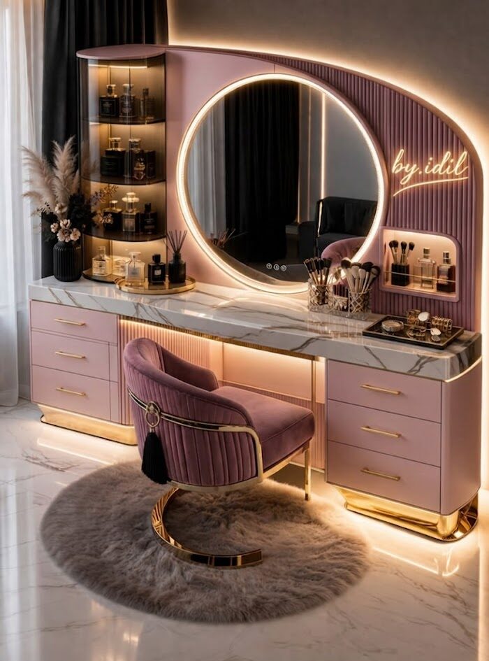 - Curated Display Architecture: Includes a vertical smoked-glass showcase tower for high-end fragrances and a recessed “beauty nook” for frequently used brushes and palettes.